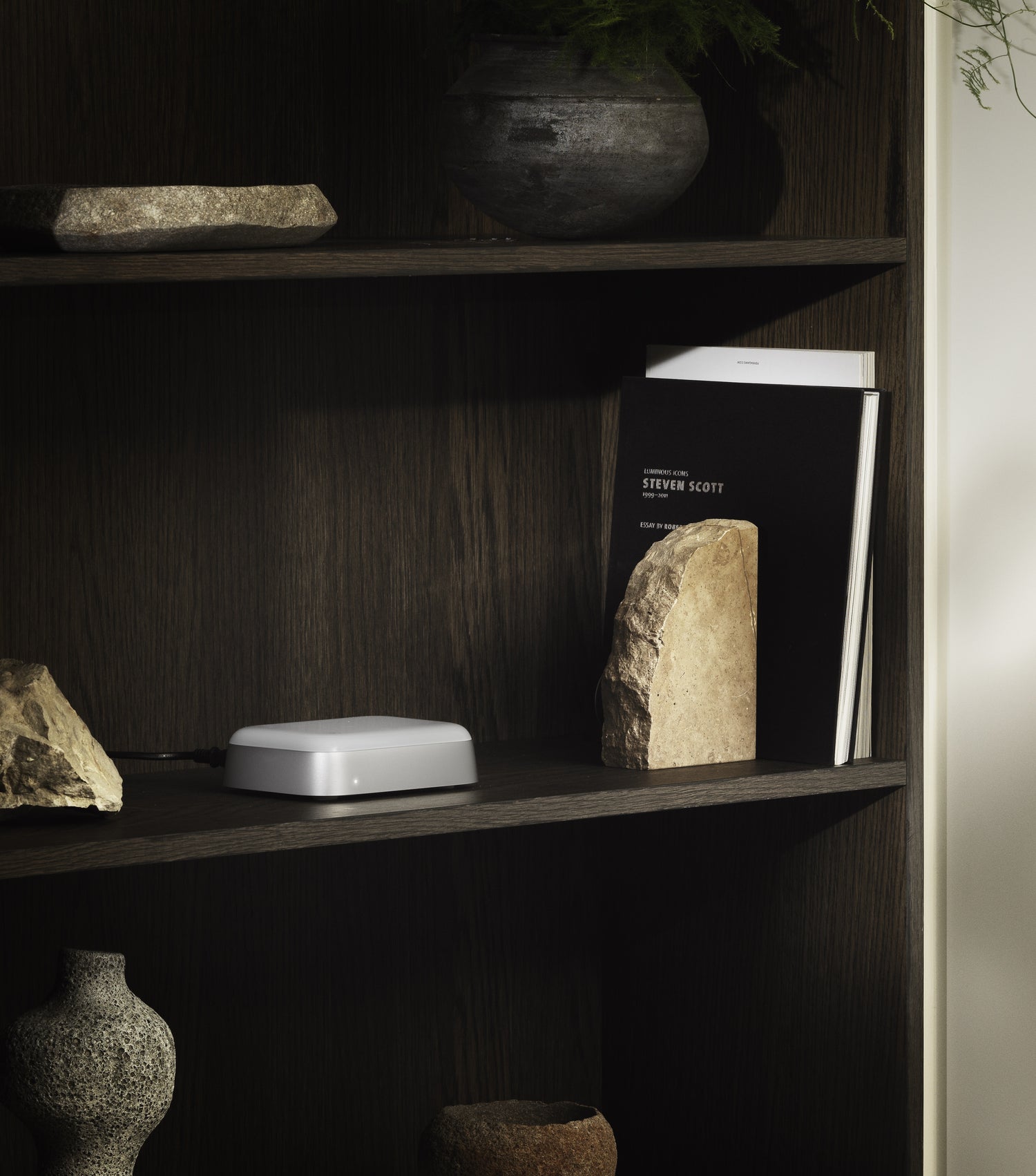 The size and shape of the Beoconnect Core is defined by the antenna and thermal requirements. With a gently curved, bead-blasted aluminum housing to absorb heat and a non-conductive cover to ensure full antenna transparency of the 7 antennas, the Beoconnect Core's slim and compact design fits into any space. Additionally, the Beoconnect Core can be installed in the Beosound Shape using a mount that can be easily docked to a Beosound Shape tile.