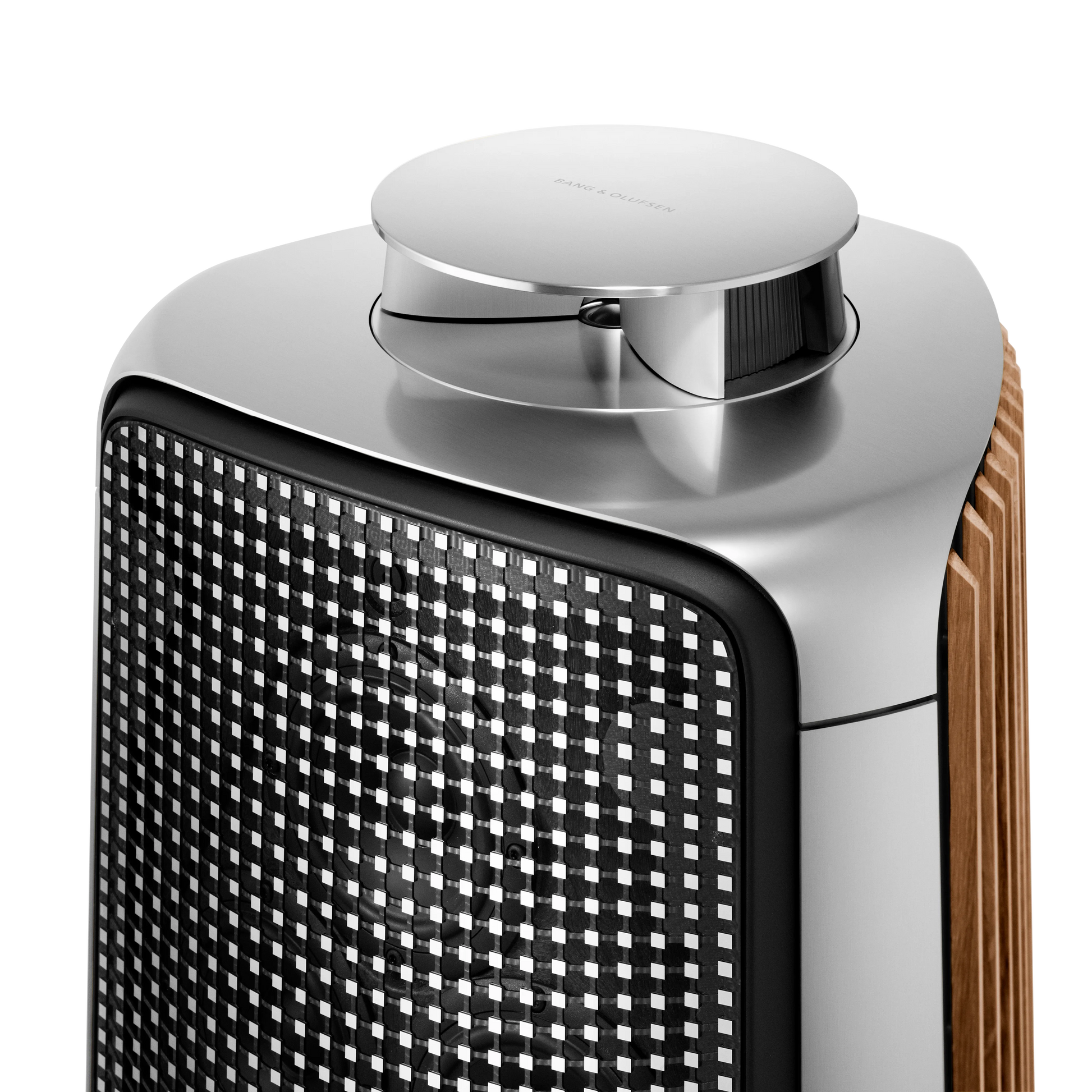 The silhouette of BeoLab 50 is slim, tall and rounded by flowing lines and visible edges. The silver polished aluminum surfaces and warm oak slats are recognizable hallmarks of Bang & Olufsen products.
