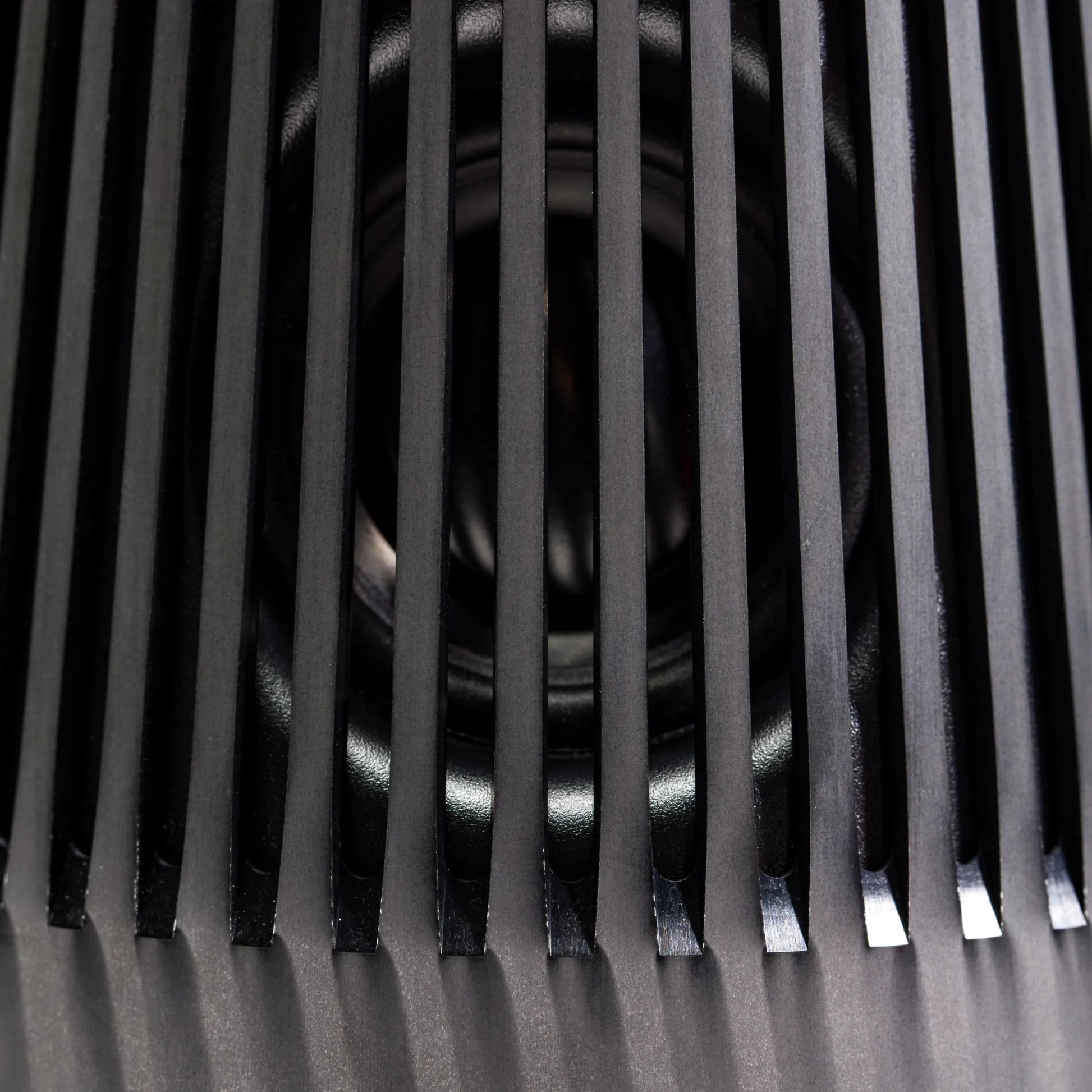 The exquisitely designed housing of Beosound 2, made from the finest aluminum and designed with a discreetly curved, conical shape, resembles a trumpet and can be seamlessly integrated into any setting, be it on a shelf or the breakfast table. Despite its subtle shape, the lower half of the case offers enough space for the bass unit, which delivers excellent sound. With built-in Acoustic Lens Technology integrated into the frusto-conical design, it offers a 360-degree listening experience that evenly fills the entire room with sound, regardless of where the speaker is positioned.