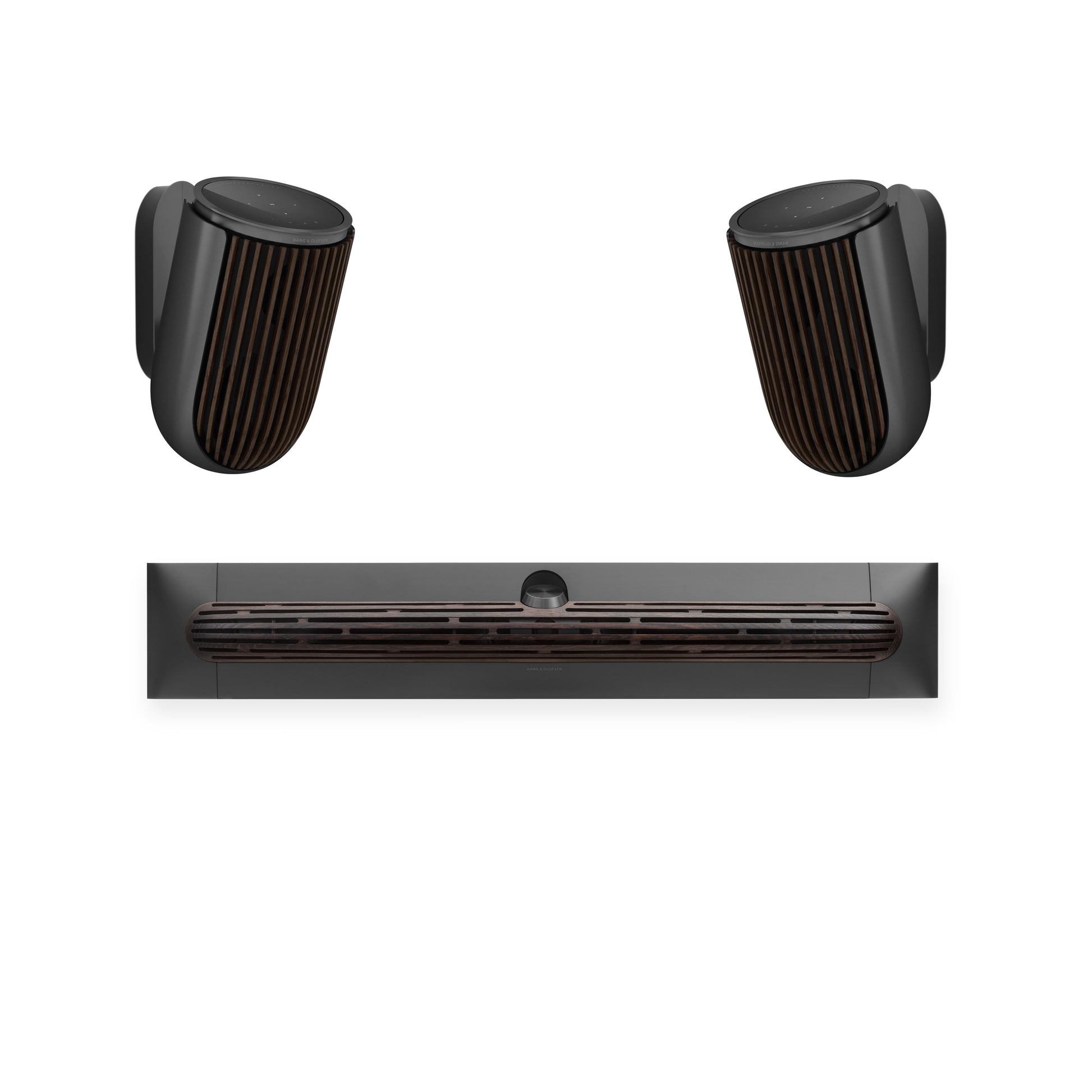 Sculptural presence: The duo unites the best of B&O's aluminum craftsmanship. The flowing lines of the Premiere harmonize perfectly with the iconic design of the Beolab 8, whether on floor stands or wall-mounted.
