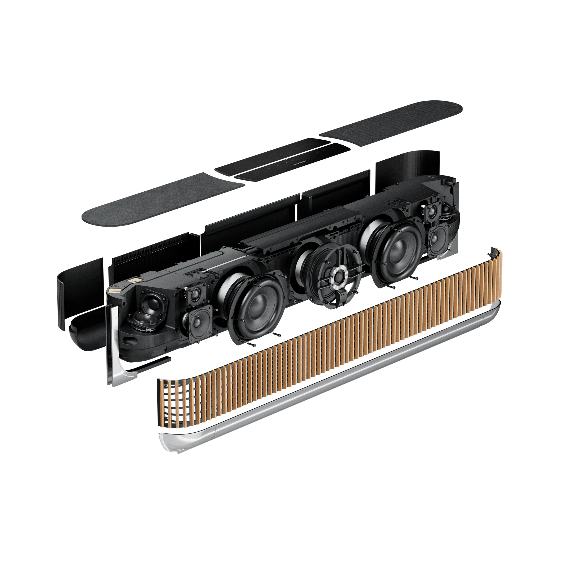 This illusion was artfully created using the aluminum expertise of Bang & Olufsen's factory in Struer, Denmark. Das in der Mitte stranggepresste Aluminiumprofil wurde poliert, eloxiert und mit zwei Endkappen versehen, die in eine gebogene Form gebracht und in vier Endkappen geteilt wurden. Dadurch passt sich die gebogene Kante des Produkts nahtlos an das flache Profil der Soundbar an, so dass ein einheitliches Stück entsteht.